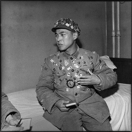 Wang Guoxiang, a model PLA soldier, shares his experiences from a meeting in Xinfa commune, where the audience pinned some 170 Mao badges on his cap and uniform to express their admiration Harbin, Heilongjiang province April 16, 1968 © Li Zhensheng