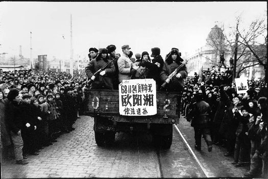 Ouyang Xiang, son of the former first secretary of Heilongjiang's provincial Party committee, is taken away by police after being publicly persecuted for sending an unsigned letter to the provincial revolutionary committee defending his denounced father