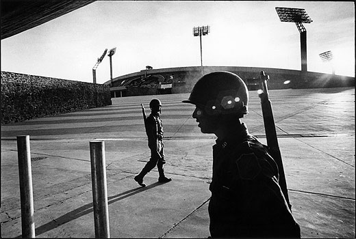 Armed forces guarding Olympic stadium in the aftermath of violent clashes between students and police Mexico City, Mexico September 24, 1968 © Gilles Caron