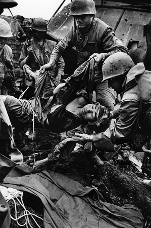 US Marines carry wounded North Vietnamese soldier, Têt offensive Hué, Vietnam February 1968 © Don McCullin